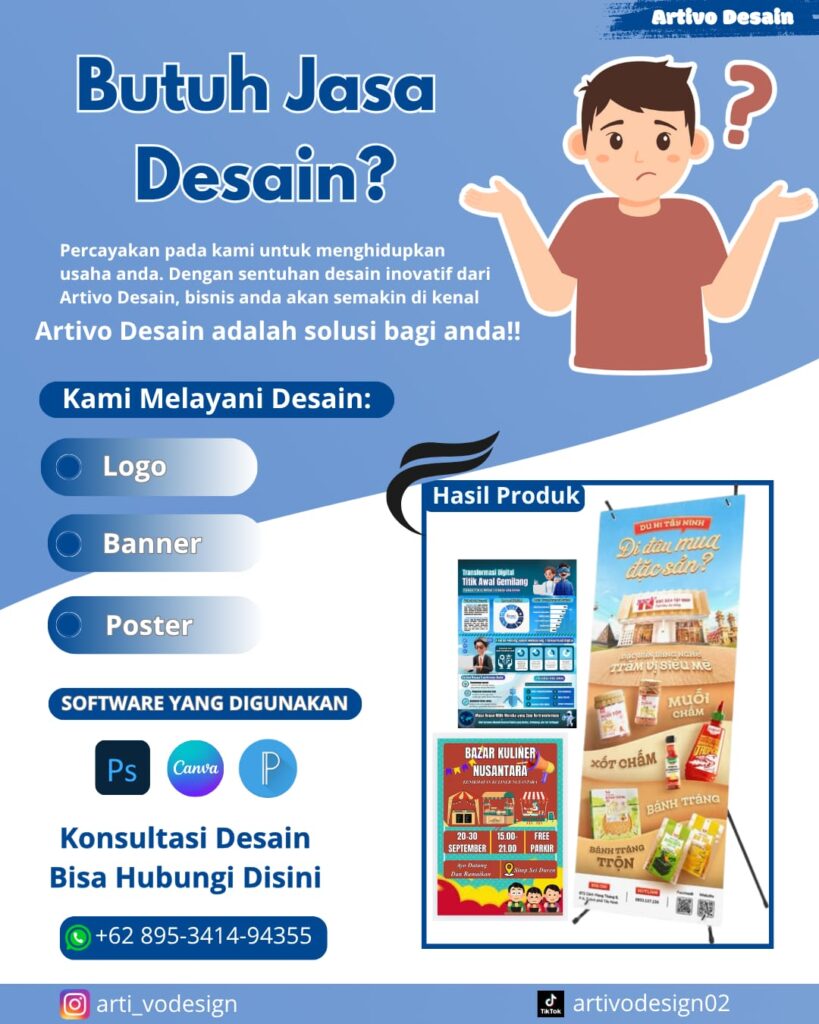 Artivo Design adalah perusahaan kreatif yang berfokus pada layanan desain visual seperti pembuatan logo, banner, dan poster dengan tampilan modern dan menarik. Kami membantu bisnis dan individu membangun identitas visual yang kuat agar lebih dikenal dan dipercaya oleh pelanggan.